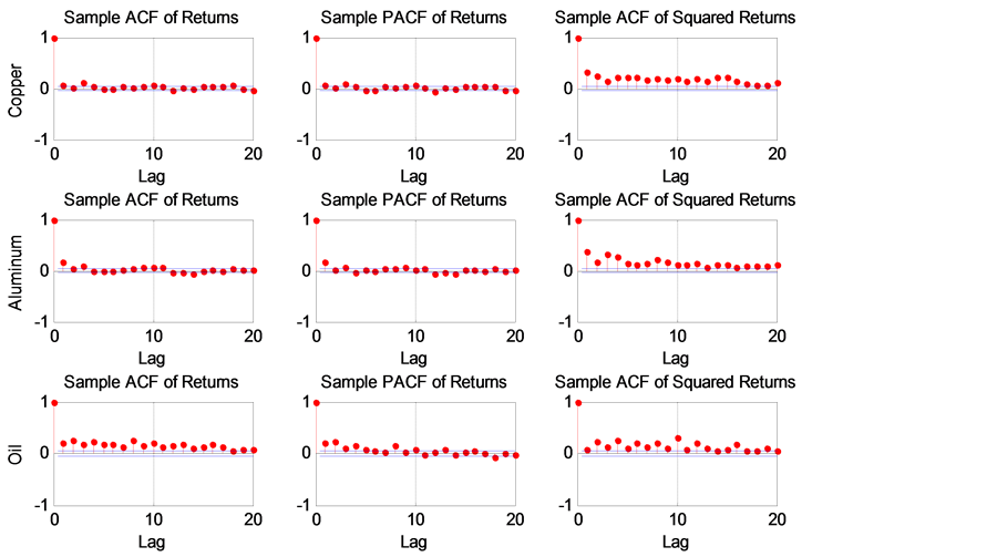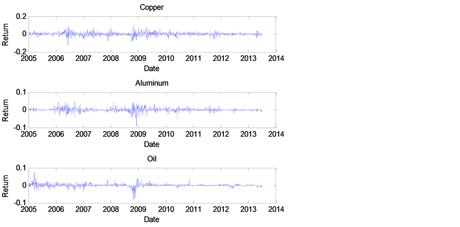 As indicated in Figure 1, the log-returns of Copper, Aluminum and Oil have significant volatility clustering and they get more distinct around financial crisis of 2008, which proves that the three pledged inventories suffered
