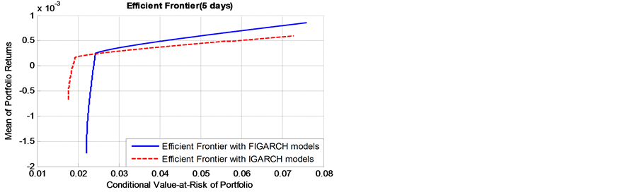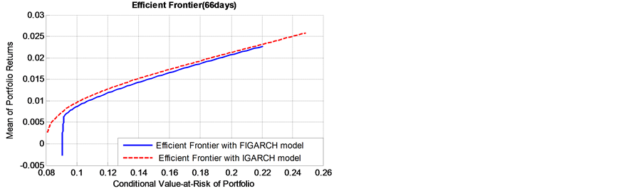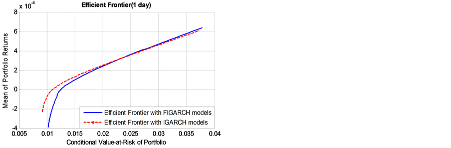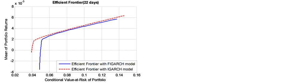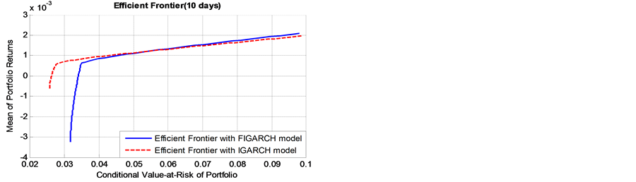 Figure 3 shows two efficient frontiers based on the long-term risk with long memory in volatility (FIGARCH(1,d,1) models) and without long memory in volatility (IGARCH models). The efficient frontiers offer maximal expected return for some given level of risk and minimal risk for some given level of expected return. In this way, we obtained the optimal portfolios.