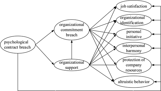psychological contract breach has indirect impact on employees’ work attitudes and behaviors by affecting organizational commitment and organizational support; 5) organizational support has indirect impact on six variables such as employees’ work behaviors and work attitudes etc. through mediating effect of organizational commitment.