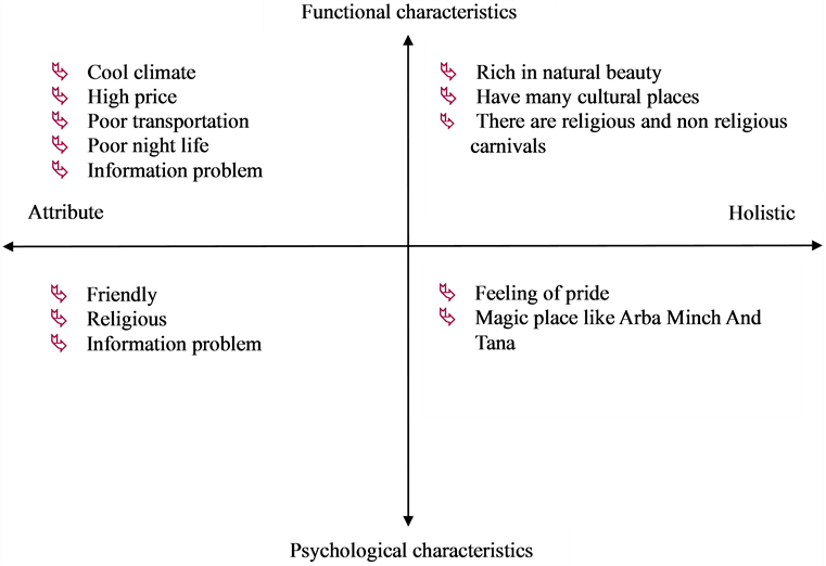 Figure 1 shows, the negative incidents (war, politics, famine, red terror and drought) has highly influencing tourists’ perception not to choice Ethiopia as a preferable destination before visiting the country with total percentage 89%. Only 9% of the respondents have positive perception that is developed because of the event of being curdle of human kind announcement and victory of Adwa. On this regard “destination branding, often suffer from negative stereotypes, and one of the primary goals of nation-branding is to counter such negative stereotypes which can be very damaging to a nation” [52] . In addition, as [53] described, because people do not have time to search for in-depth information about a specific destination or product, destination brands were a fast way to make informed decisions whether they were based on feelings or facts.