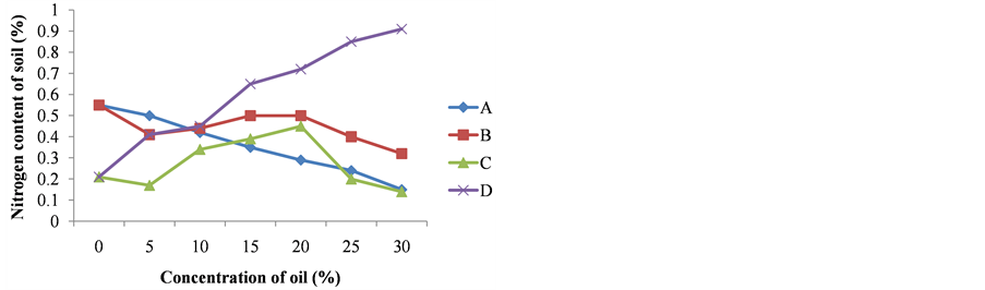 Figure 3. (a) Percentage nitrogen content of soils contaminated with crude oil and inoculated with Pleurotus species; (b) Percentage nitrogen content of soils contaminated with used engine oil and inoculated with Pleurotus species. A: Soil inoculated with P. ostreatus after 3 months. B: Soil inoculated with P. pulmonarius after 3 months. C: Soil inoculated with P. ostreatus after 6 months. D: Soil inoculated with P. pulmonarius after 6 months.