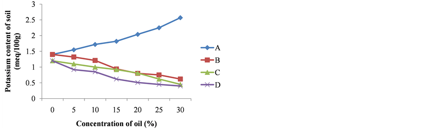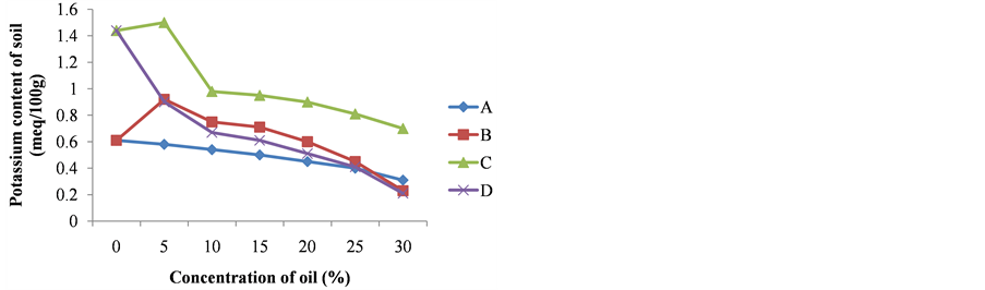 Figure 5. (a) Potassium content (meq 100 g) of soils contaminated with oils and inoculated with Pleurotus species; (b) Potassium content (meq 100 g) of soils contaminated with used engine oil and inoculated with Pleurotus species. A: Soil inoculated with P. ostreatus after 3 months. B: Soil inoculated with P. pulmonarius after 3 months. C: Soil inoculated with P. ostreatus after 6 months. D: Soil inoculated with P. pulmonarius after 6 months.