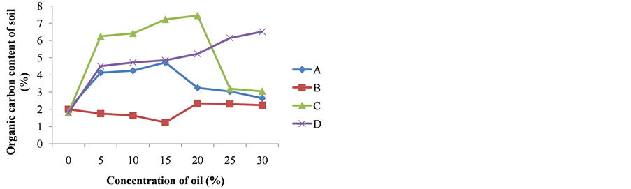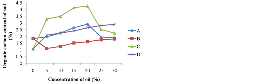 Generally, the organic matter of soil contaminated with crude oil and inoculated with P. ostreatus was higher except at concentration 30% after three months (Figure 1(a)). It was also observed that the organic matter of soil contaminated with from zero to 20% concentration used engine oil and inoculated with P. ostreatus was higher at six months. Also, there was a progressive increase in the organic matter when P. pulmonarius was inoculated after six months (Figure 1(b)).