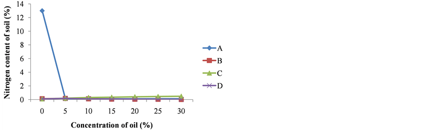 A general decrease was observed in percentage nitrogen (% N) as the concentration of crude oil applied in- creased in soils treated with P. ostreatus and P. pulmonarius after 3 months. The % N of soils treated with crude oil and inoculated with P. ostreatus was higher than that inoculated with P. pulmonarius after 3 and 6 months (Figure 3(a)). There was a progressive decrease in nitrogen content of soil with increase in concentration of used engine oil and inoculated with P. ostreatus whereas that of P. pulmonarius increased after three months from concentration 5 to 20. Also, the nitrogen content of soil inoculated with P. pulmonarius was higher than that of P. ostreatus after six months (Figure 3(b)).