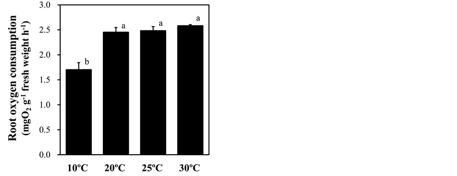Figure 5. Effect of root-zone temperature on root oxygen consumption of red leaf lettuce leaves. Vertical bars represent ± SE (n = 6). Different letters indicate significant differences by Tukey’s multiple comparison test (p < 0.05).