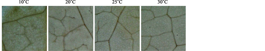 Root-zone cooling at 10˚C promoted red pigmentation of the leaves (Figure 1), suggesting anthocyanin accumulation. In accord with this observation, the anthocyanin and total phenol contents in the leaves were approximately 2-fold greater in the plants under low root-zone temperature treatment than those in plants under other temperature treatments (Figure 2(a) and Figure 2(b)). The leaf ascorbic acid content was slightly increased by root exposure to low temperature, but this difference was not statistically significant (Figure 2(c)). Leaf and root sugar contents, measured by the soluble solid content expressed as Brix degree, were elevated by the root-zone cooling treatment (Figure 3). Heating the root-zone to 30˚C led to no obvious changes in leaf Brix, but significantly increased root Brix from that of the plants with ambient conditions (Figure 3). With respect to nitrate