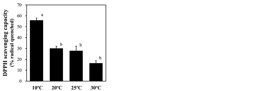 Figure 7. Effect of root-zone temperature on the DPPH radical scavenging capacity of red leaf lettuce leaves. Vertical bars represent ± SE (n = 6). Different letters indicate significant differences by Tukey’s multiple comparison test (p < 0.05).