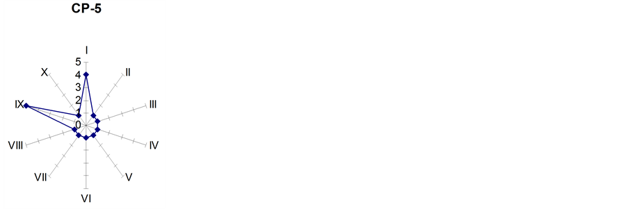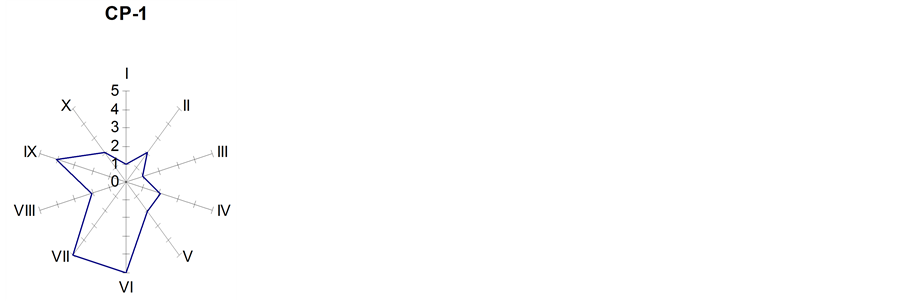 To assess of the coenopopulation state a range of selected features are divided into five classes with the same amount on a equable scale; then each class was assigned a score; lowest score corresponded to the lowest indicators (Table 1). The evaluation results are presented in the form of a multi-axis chart.