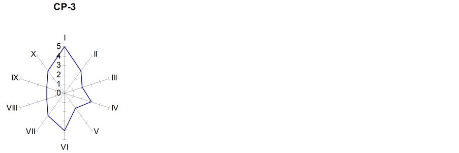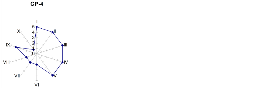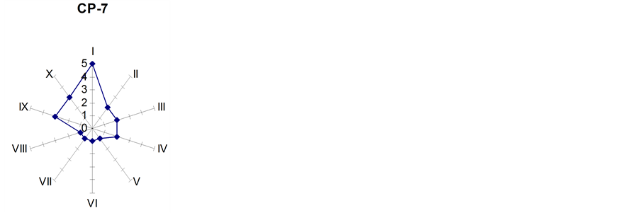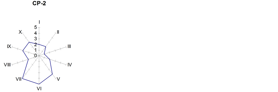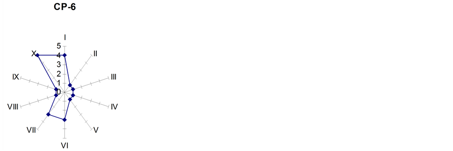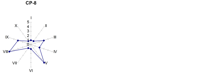 Figure 2. Assessment of T. lehmanniana cenopupulation (in points). Organismic signs: 1―reproductive effort of individuals (R/C); 2―individuals biomass; 3―plant height 4―leaves length; 5―the perianth length; Population characteristics: 6―T. lehmanniana individuals density on 1 m2; 7―ecological density of individuals/m2 (pcs); 8―the old faction share (s); 9―generative fraction share (g); 10―share of young plants fraction (j-v).