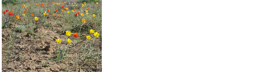 Tulipa lehmanniana, T. buhseana, T. borszczowii, T. sogdiana and T. biflora are genuine desert species from the aforementioned species. The area of the first two species covers of Turan lowland and reaches to northern China (Kashgar), and the other three species are strict endemic of Turan phyto-geographical region. Two species―recently described from Fergana Valley―Tulipa sharipowii and T. intermedia grow on gray-brown soils of the southern foothills of the Kurama Range (Western Tien-Shan) [3] . And finally, the last endemic species of Central Asia―Tulipa micheliana, mainly distributed in the northwest of the Pamir-Alay and Kopetdag, the westernmost border of its range, comes in Kyzylkum (Nurata relict mountains and Kokchatau).