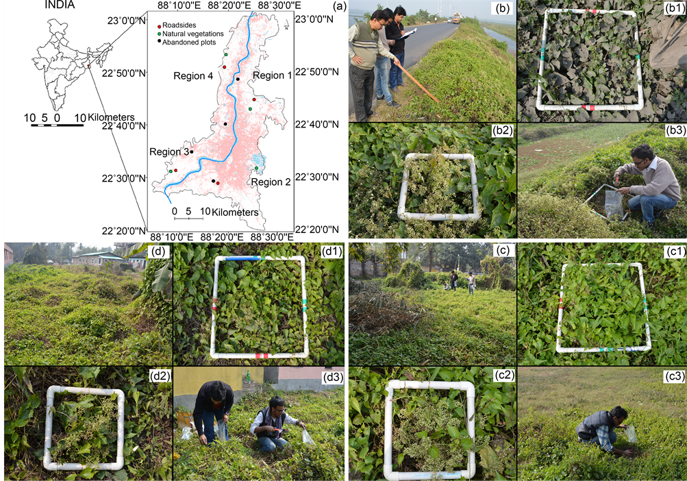 Figure 1. Site characteristics of the three habitats with M. micrantha growth. (a) Location of the three habitats in the four regions of the Greater Kolkata area; (b) M. micrantha patch along roadsides, (b1) 0.5 × 0.5 sq. m. sampling of above ground biomass, note the dust deposition on the leaves, (b2) seed sampling from within a 0.25 × 0.25 sq. m. quadrat, (b3) soil sampling; (c) M. micrantha patch in a natural habitat, (c1) above ground biomass sampling from within a 0.5 × 0.5 sq. m. quadrat, (c2) seed sampling, (c3) soil sampling; (d) M. micrantha patch in an abandoned plot, (d1) 0.5 × 0.5 sq. m. sampling of the above ground biomass, (d2) seed sampling, (d3) soil sampling.