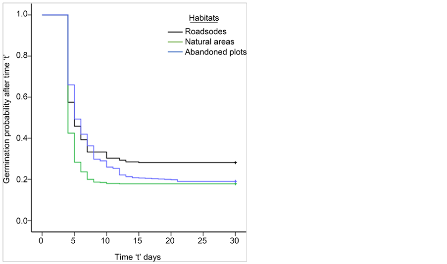 To estimate germination survival functions, the ‘germination time’ was used to calculate the germination probability, i.e. the probability that an individual seed germinates after a specific time‘t’, considering the initial event at t = 0. The germination probability was estimated non-parametrically by using the Kaplan-Meier method for every seed lot (i.e. seeds sampled from the population of roadsides, natural areas, and abandoned plots) including the censored observations. The null hypothesis i.e. no difference in the overall germination probability between groups (i.e. different habitats) was tested using the Log-rank (Mantel-Cox) test [64] [65] which calculates a Chi-square (χ2) statistic that is compared to a χ2-distribution with two degrees of freedom. The survival plot displays the time course of germination probabilities (or the germination functions) which takes the form of a non-increasing step function, starting from 1 at time 0 and approaching 0 as time increases [53] .