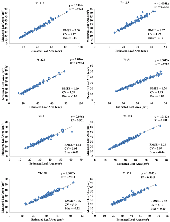 Totally, 1200 leaves (Fifty Leafs × eight Genotypes × three Locations) were used for model development and 960 leaves (Forty Leafs × eight Genotypes × three Locations) were used for model validation during leaf area measurements.