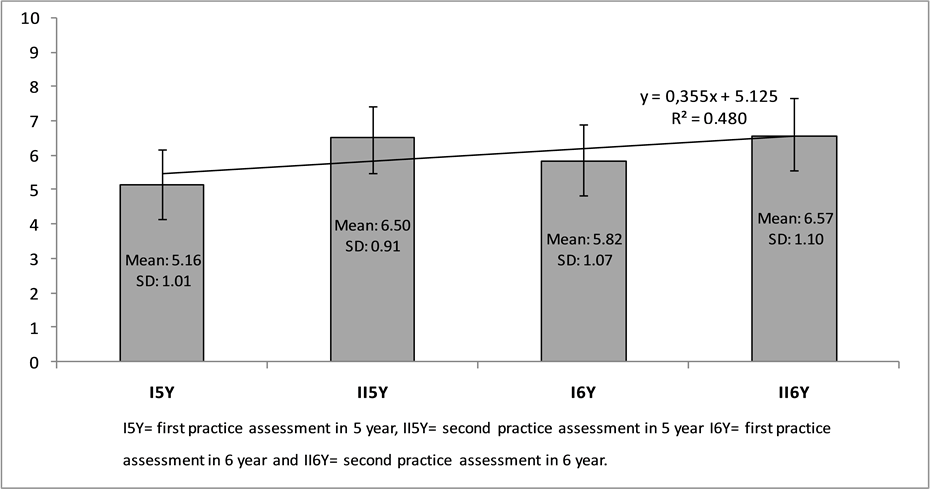 Figure 1 shows the descriptive statistics from the students’ scores in the four assessments first assessment of 5th year (I5Y), second assessment of 5th year (II5Y), first assessment of 6th year (I6Y) and second assessment of 6th year (II6Y). There is a difference between assessments (p < 0.001) with higher values in the II5Y and II6Y.