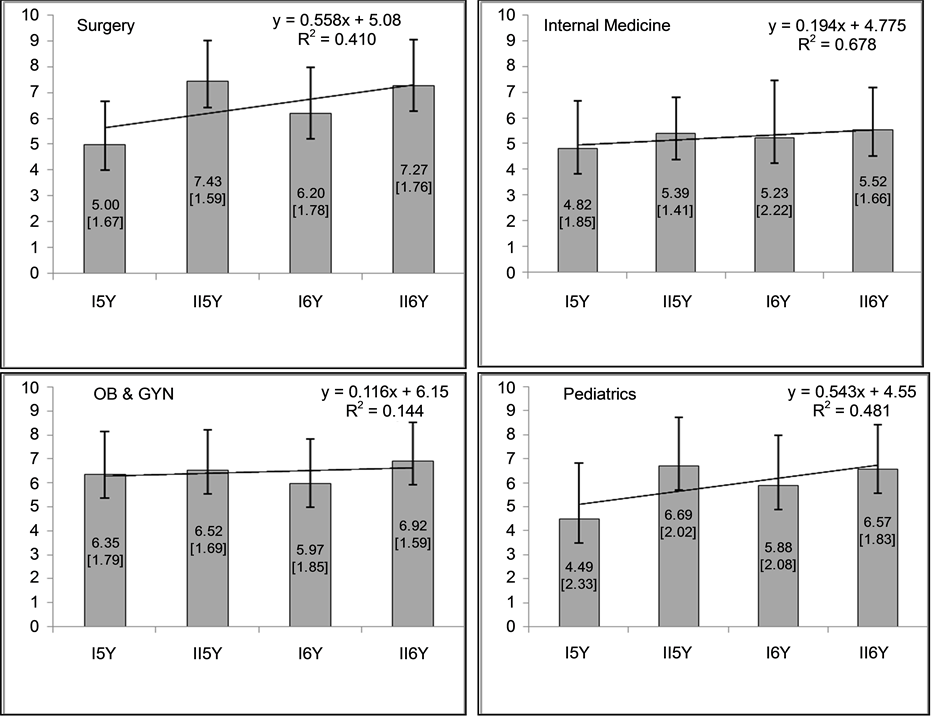 The scores were separated by stations (Surgery, Internal Medicine, Obstetrics/Gynecology, and Pediatrics) to evaluate student progress according to the medical specialties, as shown in Figure 2. There is a significant difference between assessments in all specialties (the highest value in the II5Y assessment for Surgery (Mean = 7.43 SD = 1.59), and the lowest in the I5Y for Pediatrics (Mean = 4.49, SD = 2.33). The best correlation of improvement progression (score over time) was observed in the Internal Medicine (R2 = 0,678), while the poorest was seen in Gynecology/Obstetrics (R2 = 0.144).