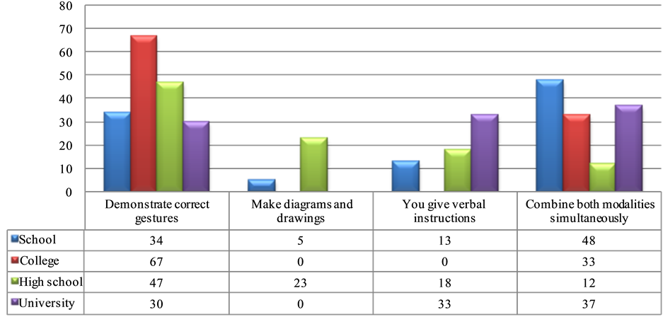 In Figure 6 most teachers at school (34%), college (67%), high school (47%), and university (30%) report that their interventions during a Volleyball session to “demonstrate correct gestures”, and those who choose to “give verbal instructions” are minority (13%) at school, none in college, (18%) in high school and (33%) at university. While (48%) of school teachers, (33%) in college, (12%) in high school and (37%) at university prefer to combine the two methods together.