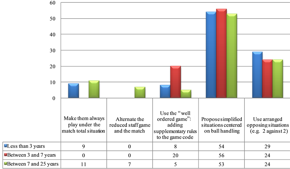 In Figure 7 during a volleyball session 54% of trainee teachers, 56% with work experience between 3 and 5 years, 53% aged between 7 and 25 years old prefer proposing simplified situations centered on ball handling, 29% of trainee teachers and 24% who have between 3, 5, 7 and 25 years of seniority choose arranged opposing situations (e.g. 2 against 2. While only 9% of trainee teachers and 11% of experienced teachers opt always for making students play under the game total situation, and 20% of teachers between 3 and 7 years of seniority prefer to use the “well ordered game” adding supplementary rules to the game code.