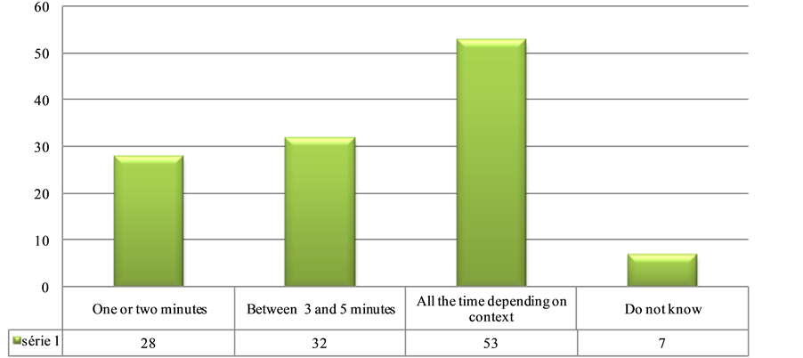 44% of interviewed teachers in Figure 1 said that the time for verbal interaction in between students during a volley ball session depends on educational context, while 23% consider that one o two minutes are satisfactory for students to verbalize, and only 27% of them are attributed to the good answer justified by experts, according to Jean-Francis Gréhaigne (1998) the discussion time given to students during a volley ball session must be limited to 3 and 5 minutes.