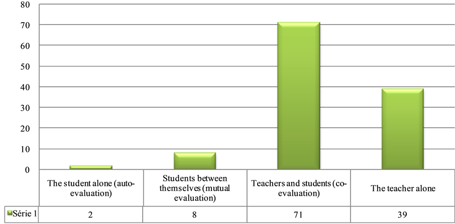Just two teachers in Figure 4 report that only the student can assist in the assessment task (self-assessment), while 39 teachers see that only teachers must evaluate in volley ball, and the majority affirm that assessment task must be performed by both; teacher and students (co-assessment).