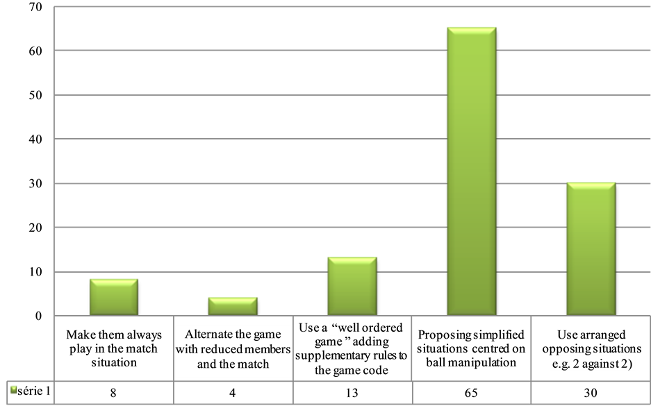 To make students learn in volley ball, interviewed teachers in Figure 5 see that it is first necessary to propose simplified situations centered on ball manipulation (54%), then to use arranged opposing situations (e.g. 2 against 2) (25%), to use “well ordered game” adding supplementary rules to its code (11%), make them play all the time under the game total situation (7%), and finally alternate the game with reduced members as well as the match.