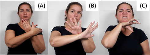 Our playful material was constructed to allow the presentation of not only iconic but also arbitrary signs. One example is the skeleton signal (Figure 2(C)) that uses the same hand configuration of spider, but crossing the arms and without movement. This skeletal sign is identified as an arbitrary signal “that bear no resemblance to the data of reality they represent” (Strobel & Fernandes, 1998). Overall, most participants did not identify the skeleton sign because it does not represent reality. Some performed it with their hands folded inward in front of their chest without movement whereas others cross their arms with the movement outward, as shown by the correct signal.