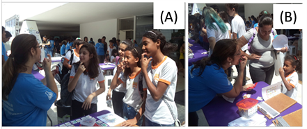 Figure 6. Adapted memory game during CST exhibition at Niterói. Visitors performing fish (A) and dog (B) signs.