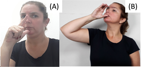 Figure 7. Water sign (A) and mimicry/gesture (B) used as examples to explain grammar features of sign languages during testing the low-cost playful strategy.