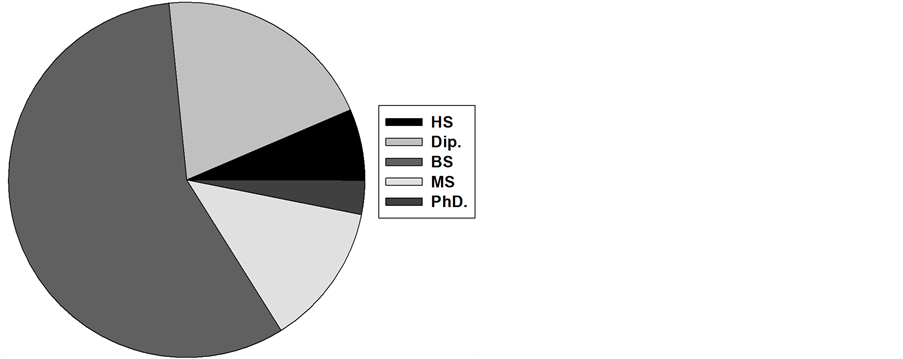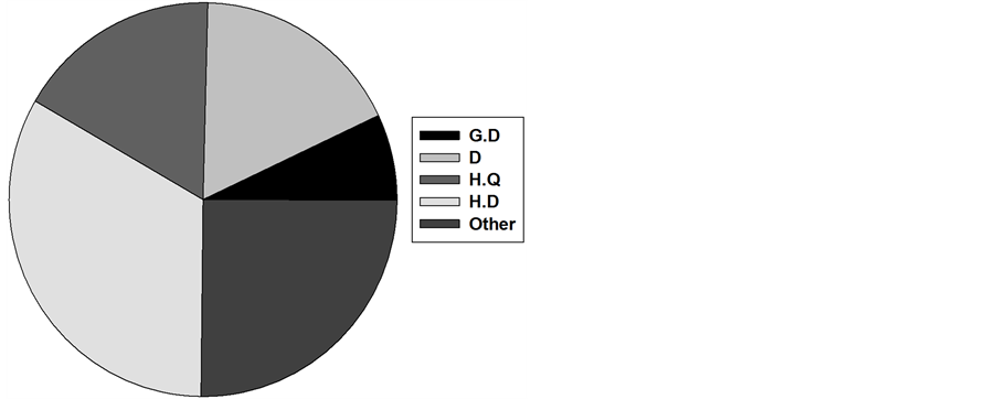 The distribution of Employee according to their jobs (Figure 3) indicates that the head department gob (H. D) accounts 33.10% which represents a high percentage on the sample size. This followed by the other jobs (other) by 25.20% and the head directors by 17.60%, while the head department (H.D) and general managers (G.M) are represent 17.0% and 17.10%, respectively. It is clear from Figure 4 according to qualification the bachelor degree (BS) represents a high percent by 57.20%, however; the diploma (Dip.), master (MS) and high secondary degree (HS) are represent 20.10%, 13.0% and 6.50% respectively.
