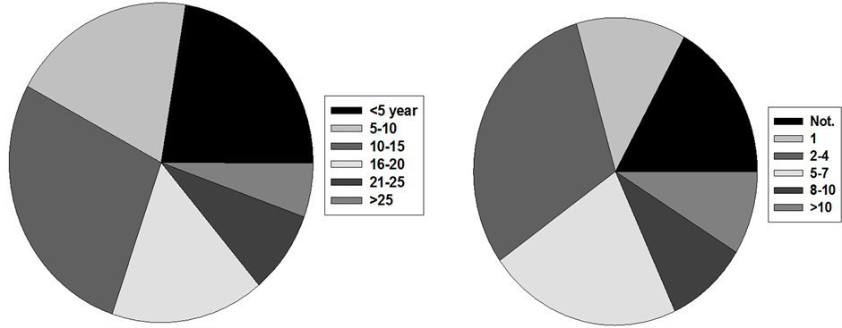 Figure 5. Distribution of employees according to years of disaster experience (a) and number of training courses in the environmental disaster management (b).