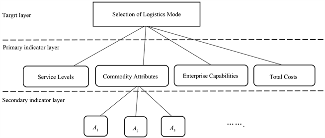 Because the decision at this time only involves the target layer (the logistics model decision of the e-commerce enterprise) and the indicator layer, the purpose is to sort the indicators, and does not involve the specific selection problem of the solution layer, so we describe this process in Figure 1, the single-level hierarchical analysis model can be used.