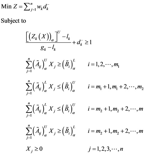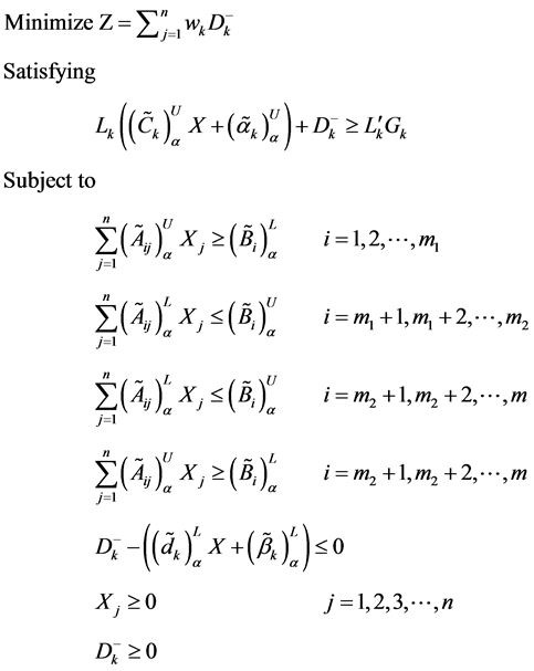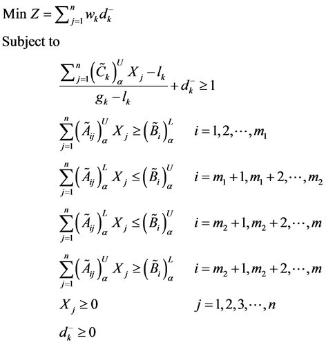 Now for a given value of α, under the framework of Goal Programming, (min-sum Goal programming) [10] , the problem under consideration can be presented as.
