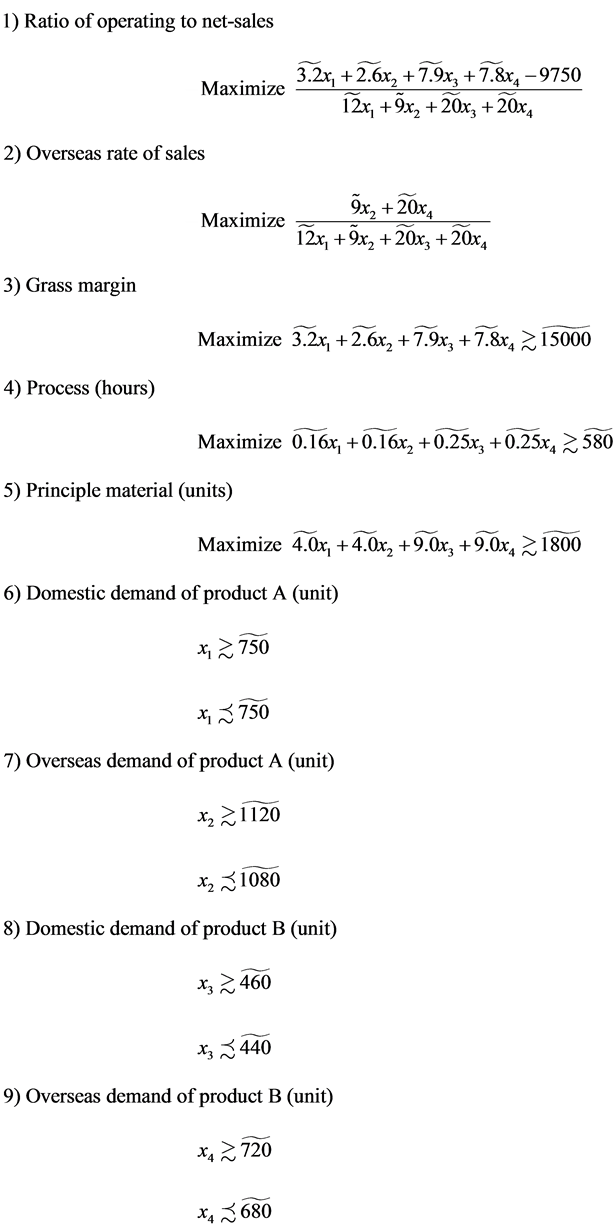 Supposing that the amount of domestic production is x1 and the amount of overseas production is x2 for product A and the amount of domestic production is x3 and the amount of overseas production is x4 for product B. Now using data from Table 1 to Table 4, the mathematical formulation for all the fuzzy goals of the under taken problem of production system are as follows.