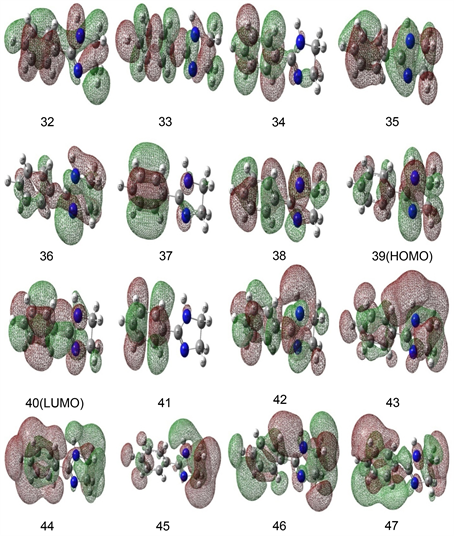Figure 6. Visualization of the molecular orbitals [MO: 32-MO: 47] of 2-phenyl-2-imidazoline under C1 symmetry: HOMO-MO: 39 and LUMO-MO: 40.