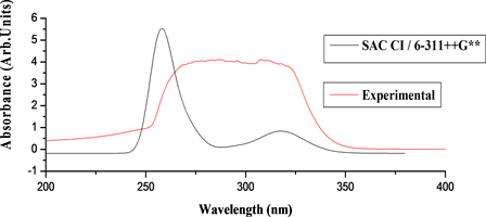 The UV-Visible absorption spectrum of the title molecule using SAC CI/6-311++G** basis set is performed to determine the lower lying excited states. The computed results involving the vertical excitation energies, oscillator strength (f) and wavelength are carried out and compared with measured investigational wavelength. These are presented in Table 7. In accordance with Frank-Condon Principle, the maximum absorption peak correspond in UV-vis spectrum to vertical excitation were carried out SAC-CI method and calculated one strong electronic transition at 272.60 nm with an oscillator strength f = 0.0658, shows good agreement with measured experimental data (exp = 273 nm) as shown in Figure 7. The addition of strong electron-withdrawing C-N substituent at the 2-position not only leads to a large red shift in Imidazoline UV-Vis absorption spectra but it also increases the light absorption efficiency of compound, owing to the facilitation of intramolecular charge transfer (ICT).