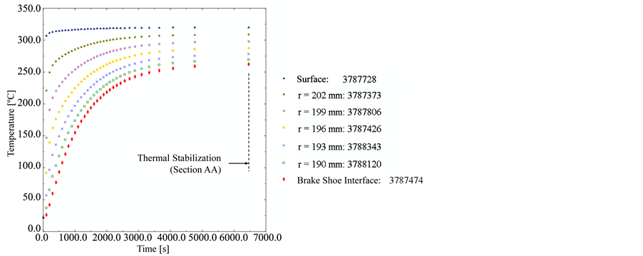temperature [3] [23] . The test was performed on a special track. The temperature of the friction film of the front brakes has stabilized in 280˚C, after approximately 1500 s of the vehicle course.