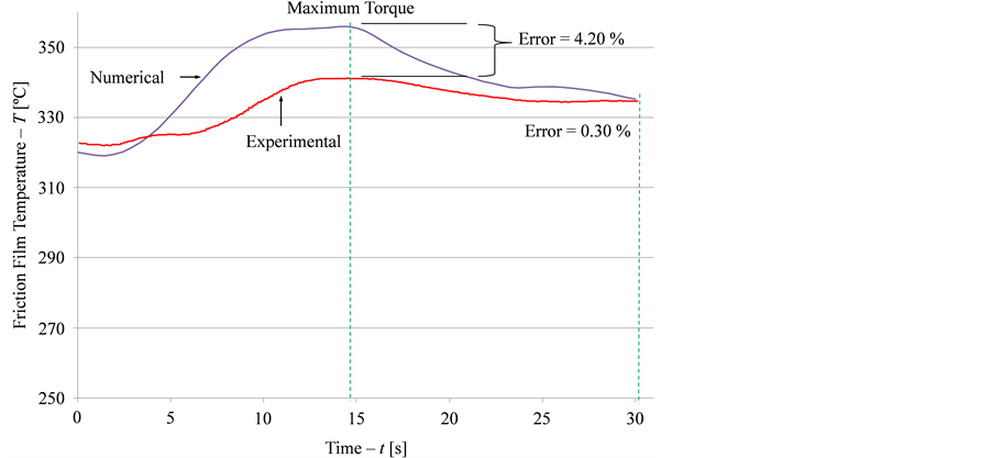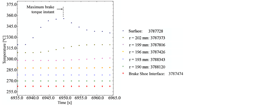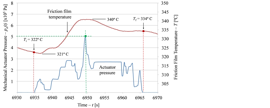 The instant of highest actuator pressure and brake torque has occurred during a braking performed between 6935 s and 6965 s of vehicle’s percuss. During this interval, the friction film temperature, T, measured by ther- mocouple positioned 1 mm from the drum’s internal surface [2] [3] , has varied between 321˚C and 340˚C (Figure 3), and the averaged friction material temperature,