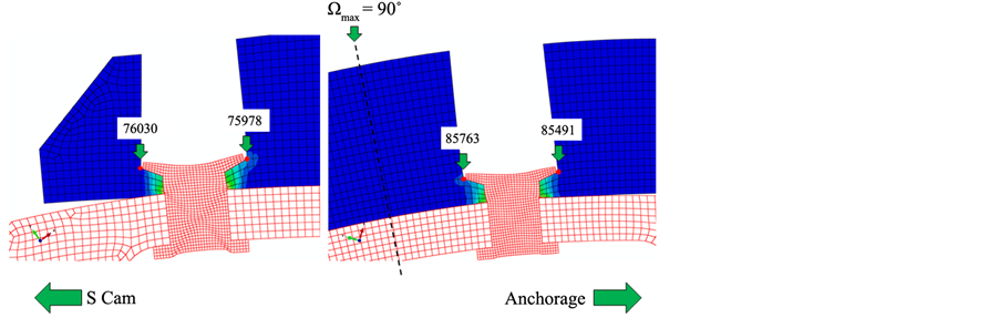 The Table 3 below, shows the stresses amplitudes on nodes 76,030, 75,978 (near to S cam) and on nodes 85,763 and 85,491, near to