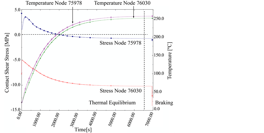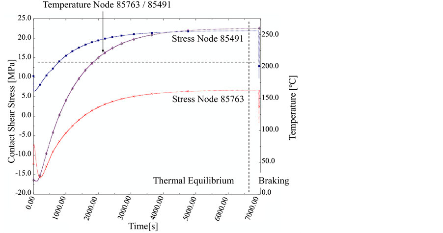 On the node 85,491 the contact stress variation during thermal equilibrium was 14.70 MPa. When the brakes were applied the stress was reduced in 12.70 MPa, showing that during braking application, there is also chang- ing of the contact shear stress orientation.