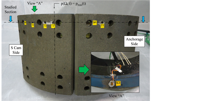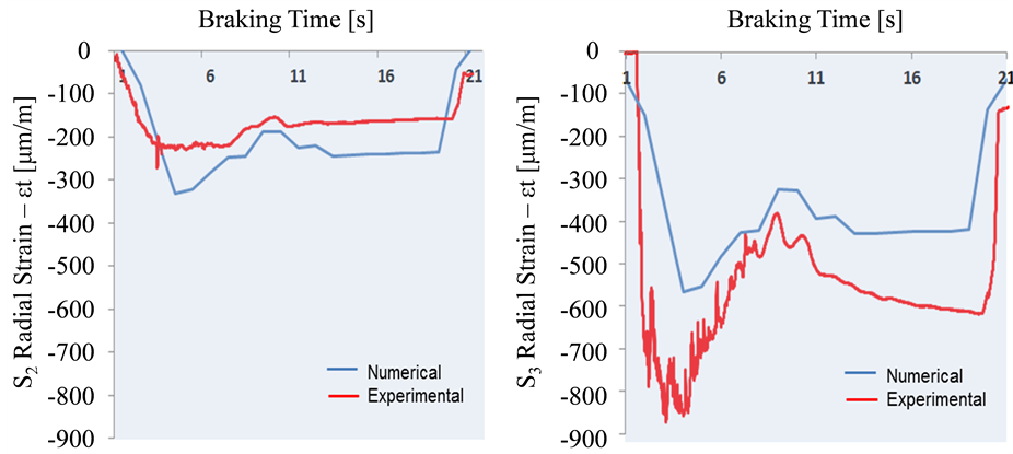 The experimental deformation was measured by two one-directional strain gages (S2 and S3) installed on the bus front brake friction material in different angular and radial positions (see Figure 16 and Figure 17) [3] . The data was obtained after one brake application (40 - 0 km/h) with brakes in cold condition (friction material temperature lower than 100˚C).