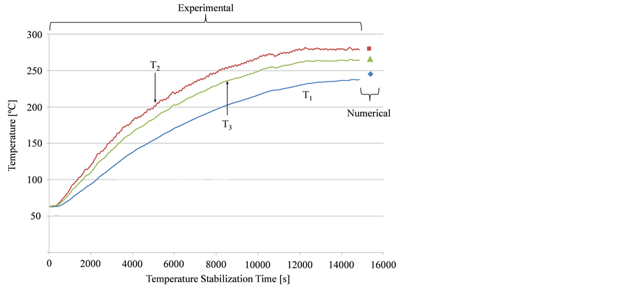 Comparison between numerical and experimental temperature after stabilization shows a very good agreement. As can be observed on Figure 19, the largest difference between experimental and numerical data corresponds to the position of thermocouple T1 (stabilization temperatures were 237.80˚C and 248.30˚C respectively for experimental and numerical data).