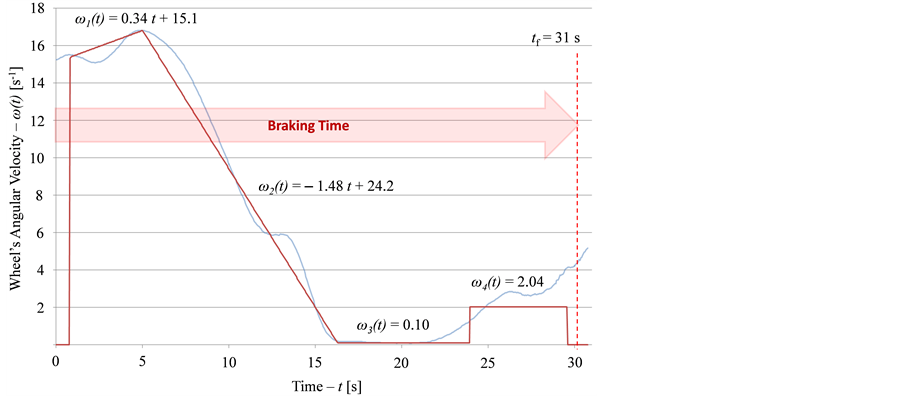On the other hand, angular velocity of the vehicle’s wheels, measured during the route, necessary to determine heat flux distribution on the lining surface, was approached into linear and continuous functions defined, per convenience, within the braking interval [0 s, 31 s], as shown on Figure A.2.