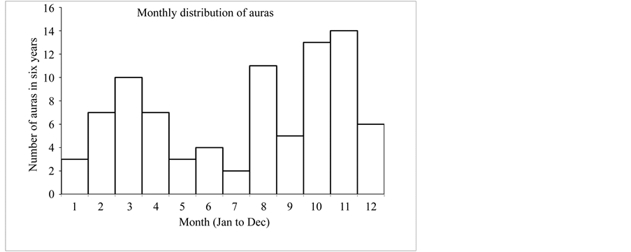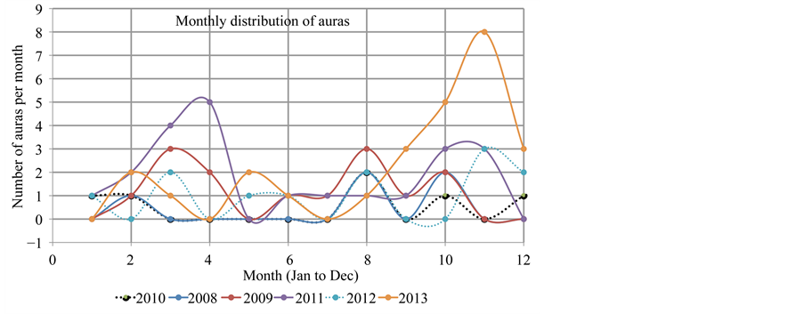Figure 1 shows the monthly aura frequencies for each of the last six years. There has been a gradual increase in the annual number of auras over these six years: 2008:5; 2009:14; 2010:6; 2011:22; 2012:12; 2013:26. Indeed, the highest monthly frequency (8) occurred in November 2013. It will be noticed that in several years there are
