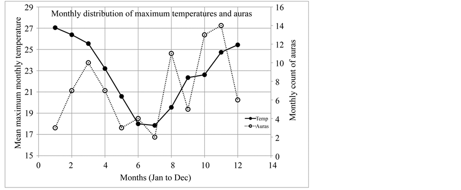 Although the equinoxes are strongly associated with reproduction and survival in both animals and plants, these functions are also dependent on several other factors. Therefore, we examined the possibility that the ambient temperature might be a triggering factor. Figure 3 repeats Figure 2 showing the monthly distribution of auras, together with a graph of the mean monthly maximum temperature over the period 2008-2013. There is a similarity between the two distributions, both are roughly U-shaped, but there are also marked differences. This suggests the possibility that temperature is a trigger for the auras, but it is clear that there is no linear relationship and the statistical analysis (below) agrees with that conclusion.