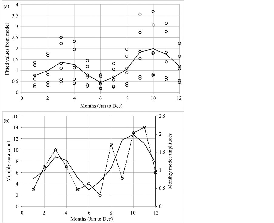 In order to examine a seasonal effect on aura, we propose to consider a generalised linear model approach. It is assumed that the number of occurrences of auras in a month follows a Poisson distribution with mean an exponential function of a linear regression using the explanatory variables: years, temperature and months (see for example, Chapter 6 of McCullagh and Nelder, 1989) [6] . A means of accounting for seasonal effects is to include a cosine function of months thus making it possible to account for annual and biannual effects (see for example Barnett, Baker and Dobson, 2012) [7] . Annual effects may be expected to be closely related to temperature and biannual effects may be related in time to the equinoxes. We will use the generalised linear model software in R (:A Language and Environment for Statistical Computing, URL: http://www.R-project.org) to fit models and select an appropriate best explanatory model for the data using as a guide the AIC (Akaike Information Criterion, see Akaike, 1974) [8] A detailed description of the analysis is given in an Appendix (Supple- mentary 1).