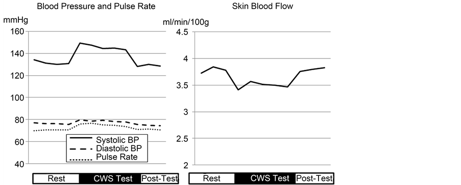 and parasympathetic activity. Morning surge and blood pressure elevation during mental stress can predict cardiovascular events. In the present study, the CWC test affected blood pressure, heart rate, and skin blood flow. These results indicate the usefulness of the CWC test as a tool for stimulating sympathetic ner- vous system activity and the measurement of skin blood flow as a sensitive index of sympathetic nerve activity.