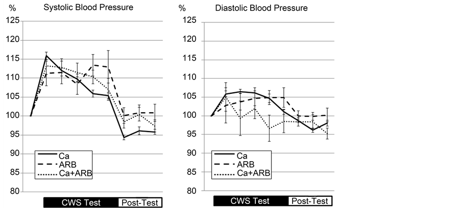 The percent change in systolic blood pressure was significantly elevated by the CWC test in the three groups (p < 0.01) and there was no significant difference in the percent change among the three groups. The percent change in diastolic blood pressure was lower in the CCB + ARB group than in the CCB (p = 0.042) and ARB (p = 0.034) groups (Figure 2).