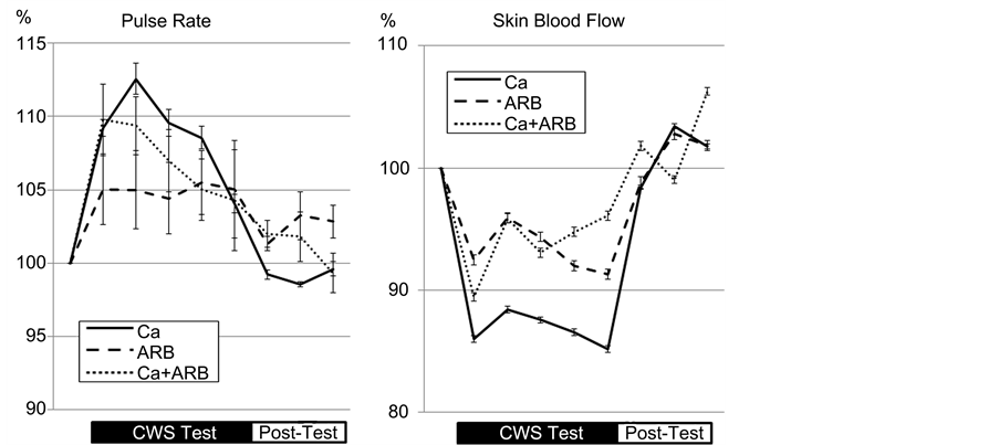 Two classes of drugs commonly used in Japan are calcium channel blockers (CCBs) and angiotensin II receptor blockers (ARBs). CCBs affect sympathetic activity either directly or by reducing blood pressure. L-type CCBs increase sympathetic activity [7] [8] [9] and ARBs have a potent suppressive effect on sympathetic activity [10] [11] . In the present study, the response of blood pressure, pulse rate [12] , and skin blood flow to the CWC test was evaluated to determine the sympathetic response to mental stress in essential hypertensive patients treated with different types of antihypertensive drugs.