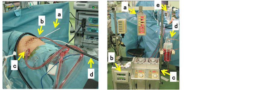 Figure 5. Intraoperative perfusion system of intrapleural hypotonic hyperthermic chemotherapy (IPHHC) perfusion system ((A) and (B)). (A) Intraoperative right side lying position under general anesthesia. The initial left posterolateral thoracotomic incision scar was observed. a: Intrapleural thermometer; b: Inflow tube; c: Outflow tube; d: Thoracoscopy. (B) Intrapleural hyperthermic perfusion system. a: Monitoring of intracircuit temperature; b: Incubator; c: Two roller pumps for inflow and outflow; d: Circuit reservoir; e: Drip infusion to the reservoir.
