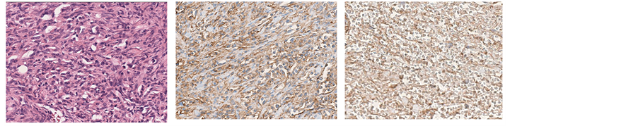 Figure 6. (A) Histological examination of the specimen showed highly cellular growth of atypical spindle cells with storiform pattern (Hematoxylin and Eosin staining) (B) and (C). Immunohistochemical staining using a standard avidin-biotin technique; the tumor cells were positively stained for the markers, including CD31 (B) and Factor VIII-related antigen (vVF/ Factor VIII) (C).