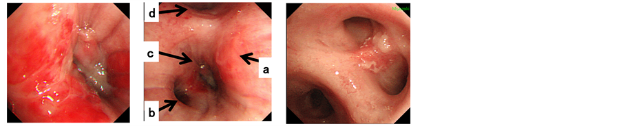 Figure 2. Bronchoscopic findings. (A) Endobronchial stenosis of the left lower bronchus B8,9,10; (B) Peribronchially, tumor invasion was suspected to the left main endobronchial membraneous portion. (a) Extrabronchial invasion to the left main endobronchial membraneous portion; (b) Normal B6 bronchus; (c) stenotic orifice of the left B8,9,10; (d) The left upper bronchus; (C) In situ squa- mous cell carcinomain the right B6.
